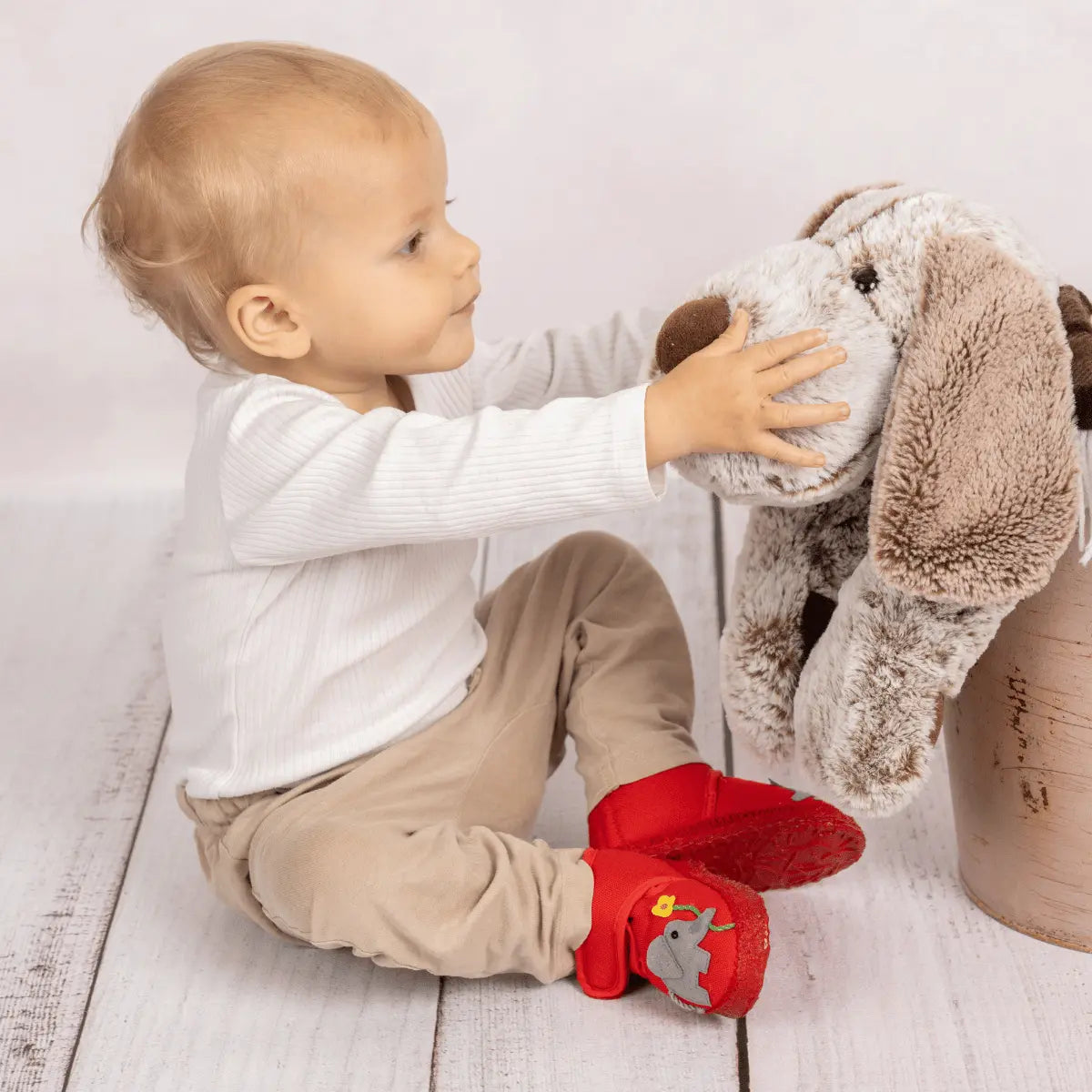 DUMBO red with grey appliqué. Only the best for our little ones: for kids who love animals! Our top model from the current collection, uniquely designed yet goes with every outfit! For parents who are looking for something special. A beautiful embroidery on a solid background. When the next adventure is just around the corner. The new "Kletter" baby walker from NANGA. Perfect fit, easy to handle, thoroughly tested, it provides the right support for first steps and beyond. The natural rubber sole guarantees no slipping. Dumbo really does go with every outfit. The first shoe for a whole new and exciting future. This model is available in baby sizes 18 to 26.