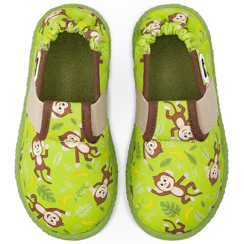Tauche ein in eine fröhliche Welt voller Spaß, Bewegung und kleiner Äffchen – mit dem grünen Schuh, auf dem verspielte Affen und bunte Blätter zu sehen sind! 🍃💚