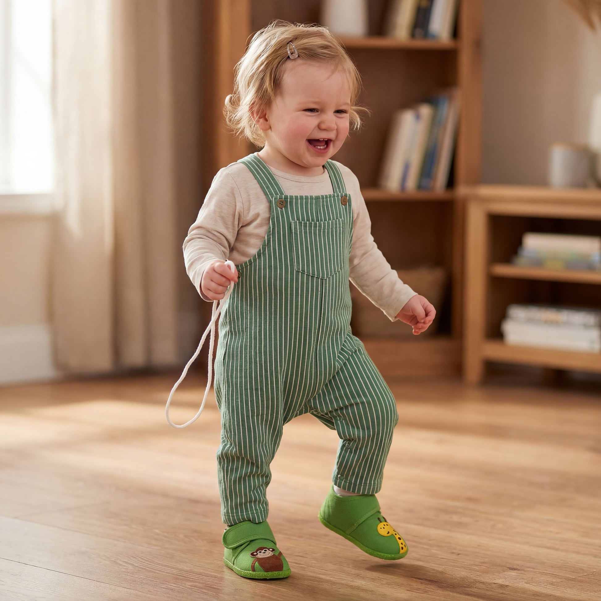 Unser Modell AFFE in frischem Grün mit liebevoll gestalteter Affen- und Giraffen-Applikation bringt sofort gute Laune ins Kinderzimmer! Verspielt im Look und gleichzeitig vielseitig kombinierbar – perfekt für Eltern, die natürliche Farben und kindgerechtes Design schätzen. ✨