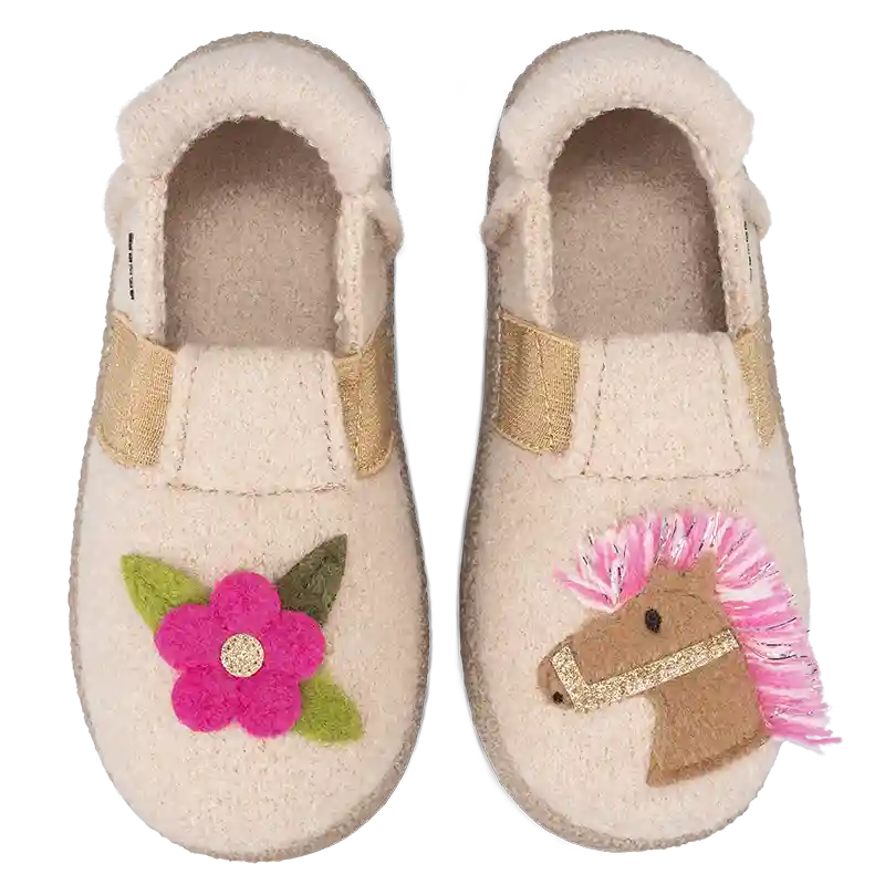Mit Little Horse wird jeder Tag zu einem kleinen Abenteuer! Auf dem beigen/naturfarbenen Schuh zeigt sich auf der einen Seite ein süßer Pferdekopf mit Wallemähne, auf der anderen Seite eine fröhliche pinke Blume – ein zauberhafter Hingucker für alle kleinen Pferdefreunde und Naturentdecker. 💛🌿